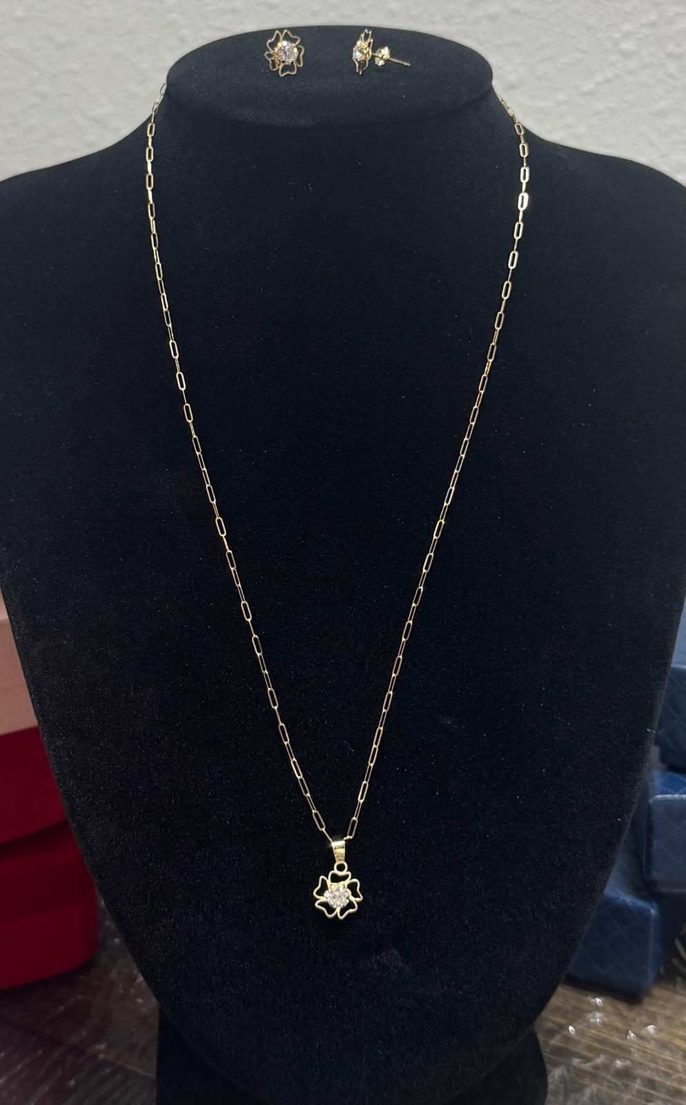 bella cadena de eslabones en oro 18k Italiano fabricada por nuestros artesanos tres en uno cadena sarcillo dije flor 5 hojas medida 18 pulgada