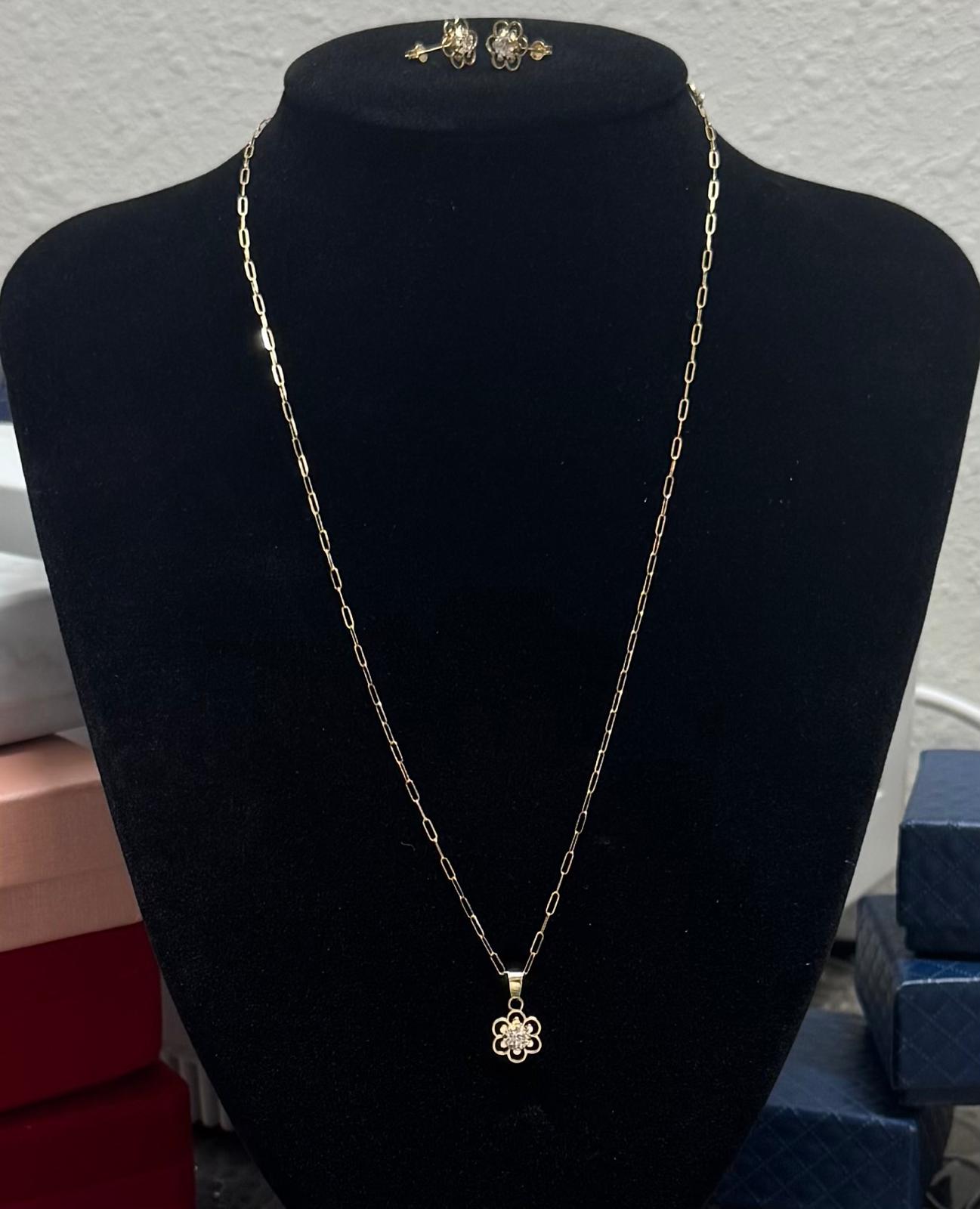 bella cadena de eslabones en oro 18k Italiano fabricada por nuestros artesanos tres en uno cadena sarcillo dije flor6 hojas medida 18 pulgada