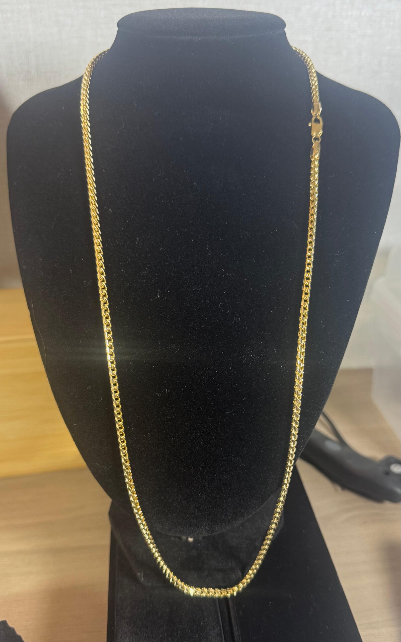 Elegante cadena confeccionada en oro sólido 18k estilo fanco, con un acabado fina que combina distinción y calidad. Con una longitud de 25 inches (63.5 cm),peso 39 gramos , espeso 4mm es perfecta para quienes valoran la sofisticación en cada detalle.