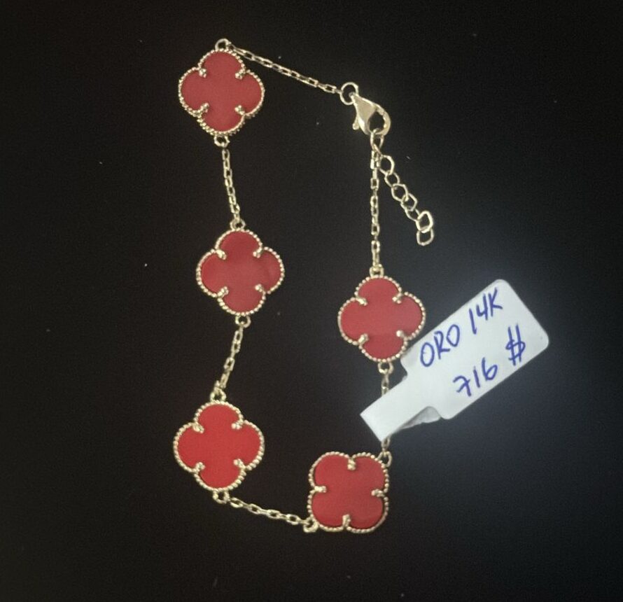 Pulsera con flores rojas oro 14k